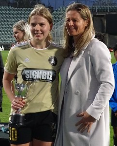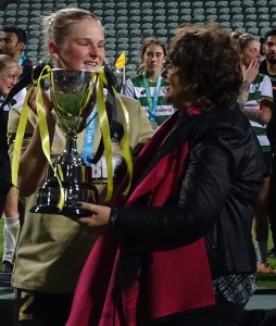 ![]() Talisha Green (AU) receives the trophy from NZF President Johanna Wood