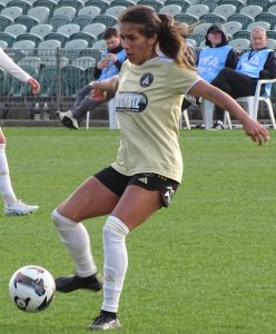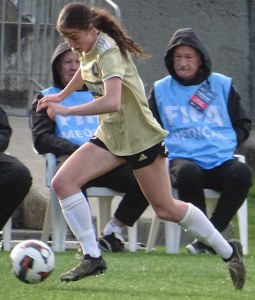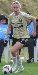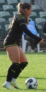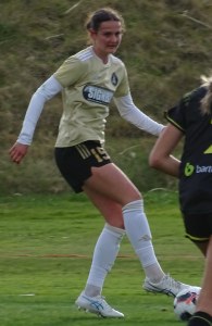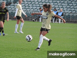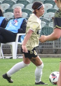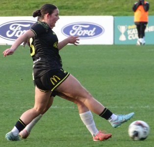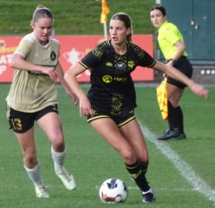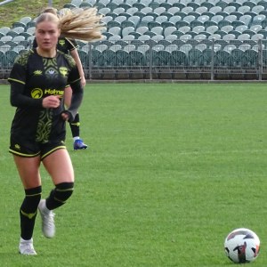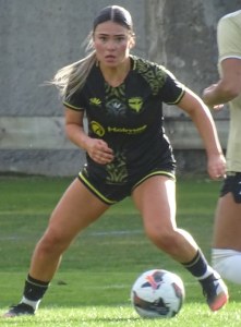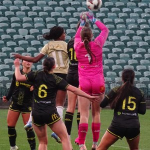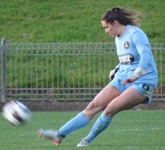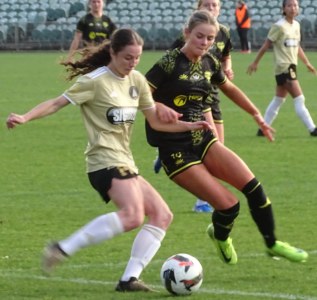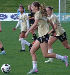 ![]() Ava Collins (AU) flicks the ball on, watched by Ella McMillan (WP) and Danielle Canham (AU)