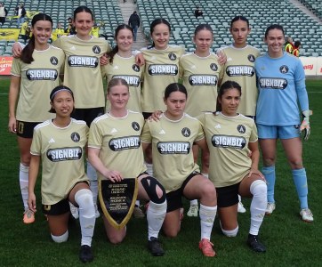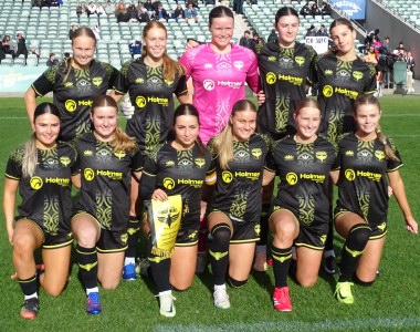 ![]() Wellington Phoenix - Standing: Ella McMillan, Amber de Wit, Brooke Neary, Alyssha Eglinton, Freya Des Fountain