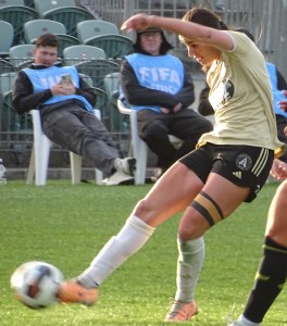 ![]() Zoe Benson (AU) opens the scoring from the penalty spot, beyond the diving Brooke Neary (WP)