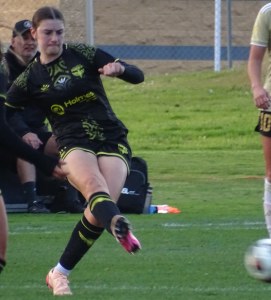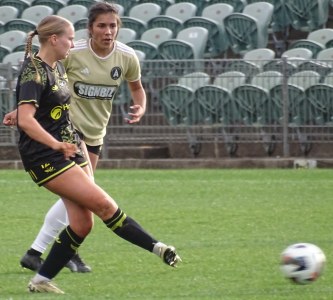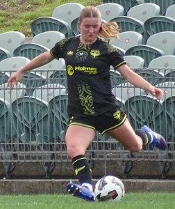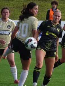 ![]() Ella McMillan (WP) gets a pass away under the watchful eye of Chloe Knott (AU)