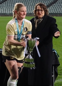 ![]() The stage is yours! NZF President Johanna Wood presents the Kate Sheppard Cup to Talisha Green (AU)