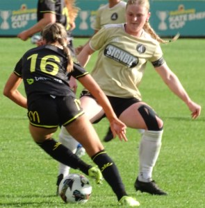 ![]() Lily Brazendale (WP) prepares to take on Talisha Green (AU)
